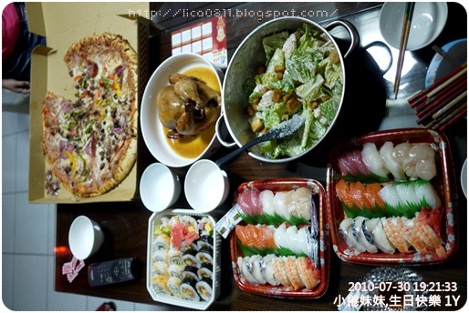這天同時上桌的是滿桌的costco佳餚。新口味的總滙披薩、超熱賣的烤雞、我們一家人很愛的凱撒沙拉、外加一盒海苔捲、二盒握壽司。